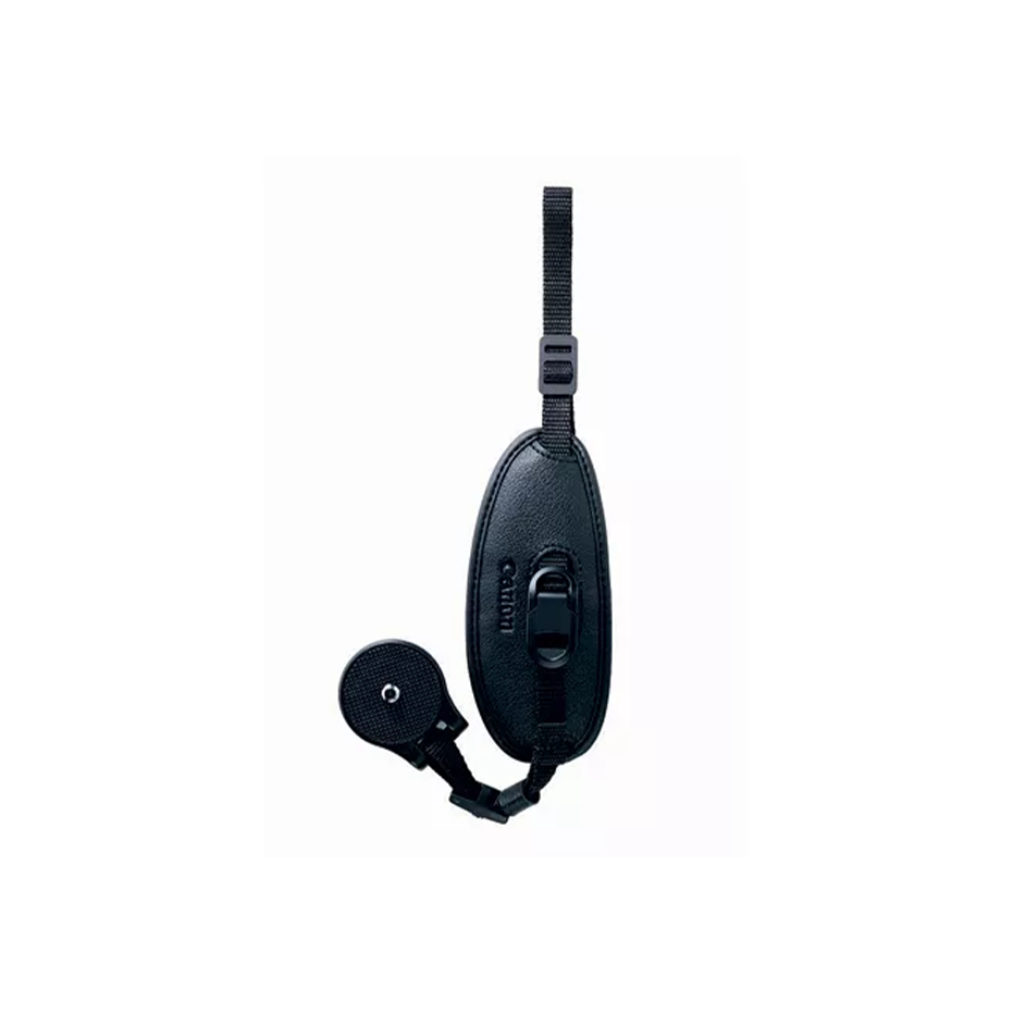 A alça de mão Canon E2 foi projetada para oferecer suporte e conforto ao segurar uma câmera SLR Canon com a mão. A alça se prende aos ilhós nas laterais da câmera.
