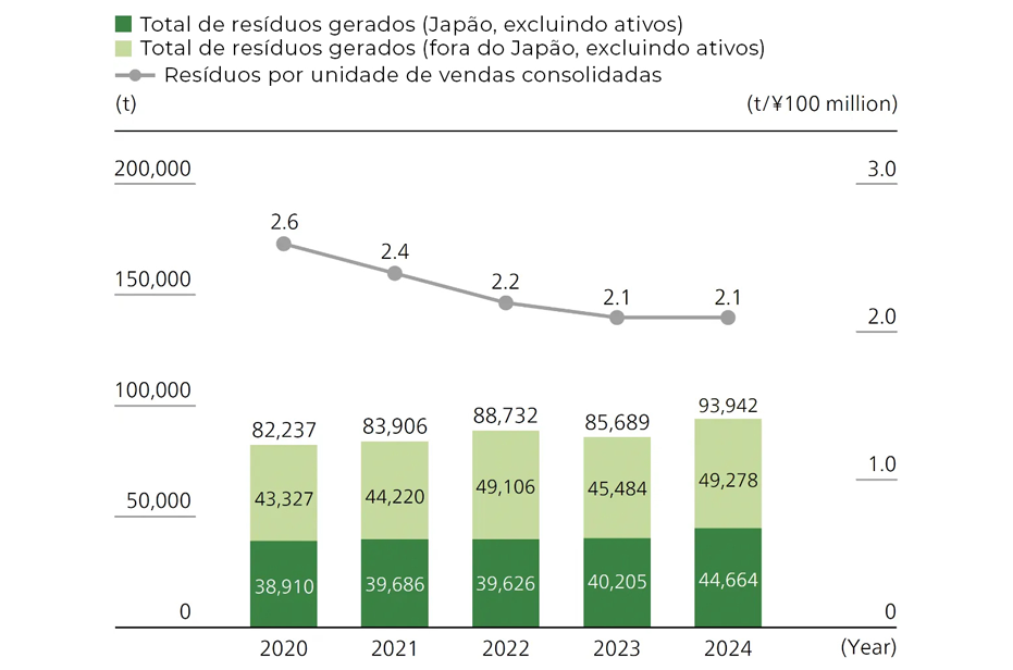 A Canon trabalha ativamente para reduzir a quantidade de resíduos gerados em suas operações e para reutilizar ou reciclar resíduos sempre que possível, descartando adequadamente qualquer resíduo que não possa ser reutilizado ou reciclado, de acordo com a legislação vigente. Nossas diversas unidades operacionais empregam uma série de programas de reciclagem interna, incluindo o reprocessamento de resíduos plásticos provenientes da moldagem por injeção para a fabricação de bancos de madeira artificial ou a reciclagem para outros itens. Mesmo no caso de resíduos que precisam ser enviados para fora da empresa, terceirizamos a reciclagem de cada recurso para garantir que não sejam destinados a aterros sanitários*. Em vez disso, contratamos empresas que reprocessam os resíduos transformando-os em materiais. Em 2024, as empresas contratadas processaram 92.229 toneladas de resíduos da Canon, transformando-os novamente em materiais.