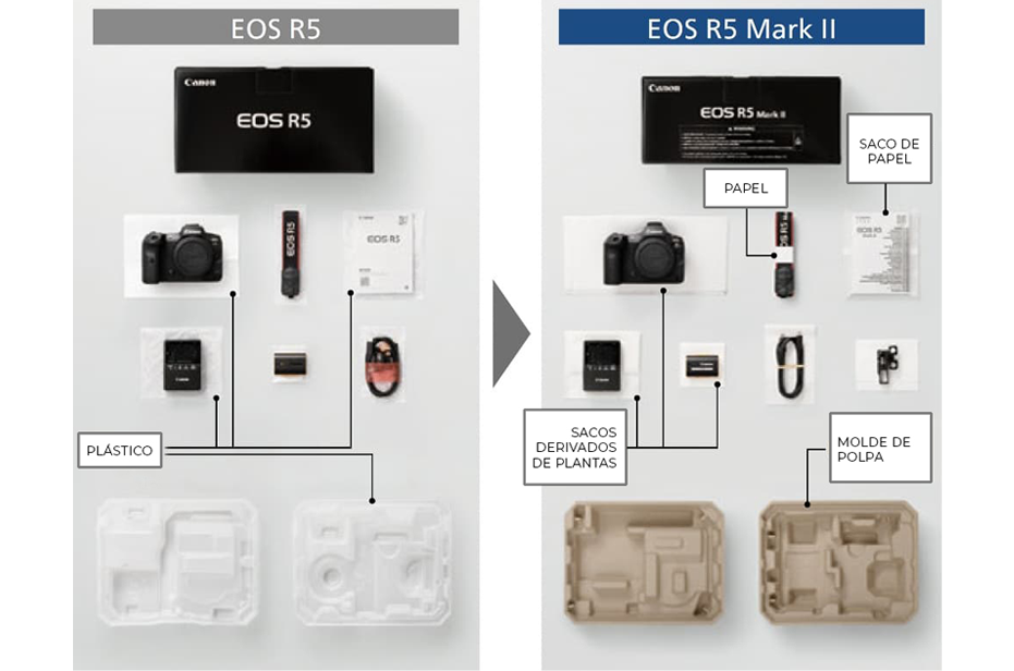 A EOS R5 Mark II adotou tecido não tecido de origem vegetal e sacolas de papel, reduzindo o uso de plástico na embalagem.