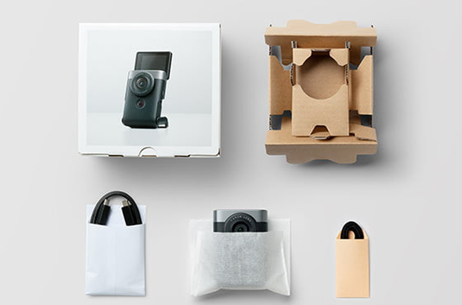 A PowerShot V10, por exemplo, utiliza tecidos não tecidos de origem vegetal e materiais de papel para as sacolas usadas na embalagem da câmera e seus acessórios. A escolha desses materiais reduz o uso de plásticos descartáveis e minimiza o impacto ambiental.