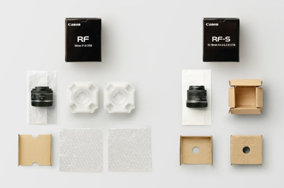 Para a embalagem da lente RF-S10-18mm F4.5-6.3 IS STM, estamos nos esforçando para utilizar tecidos não tecidos de origem vegetal e materiais de papel pela primeira vez em nossos produtos de lentes.